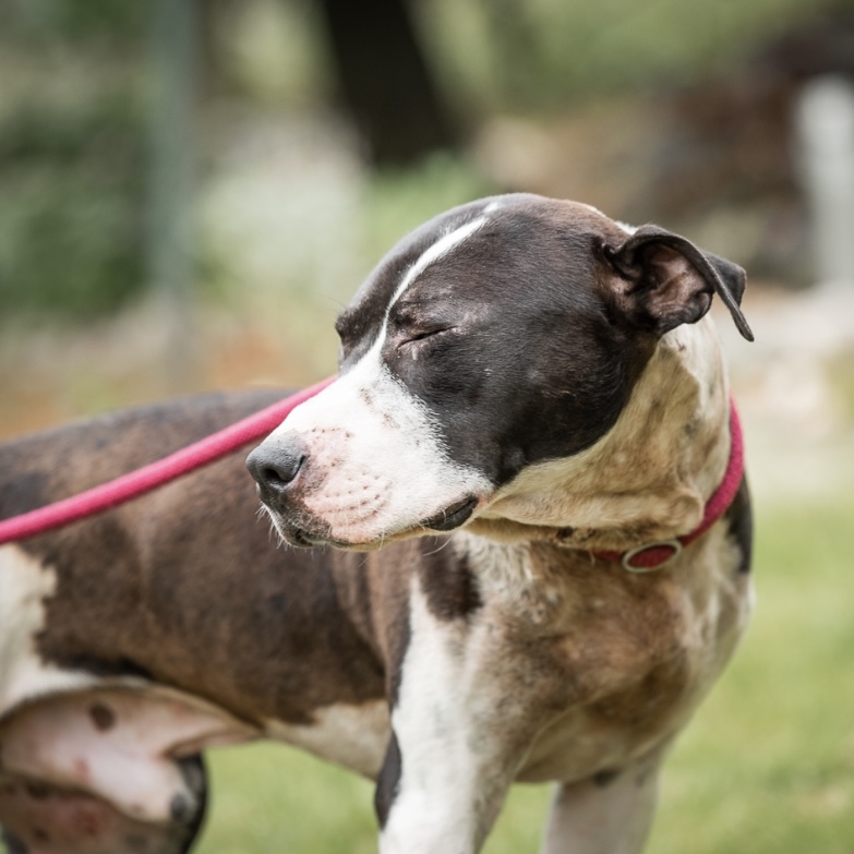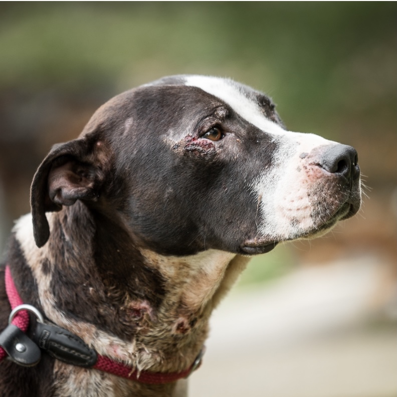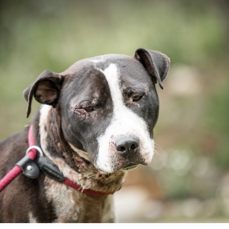 Atze haben wir völlig zerbissen von der Straße aufgelesen. Er wurde vermutlich für Hundekämpfe missbraucht.